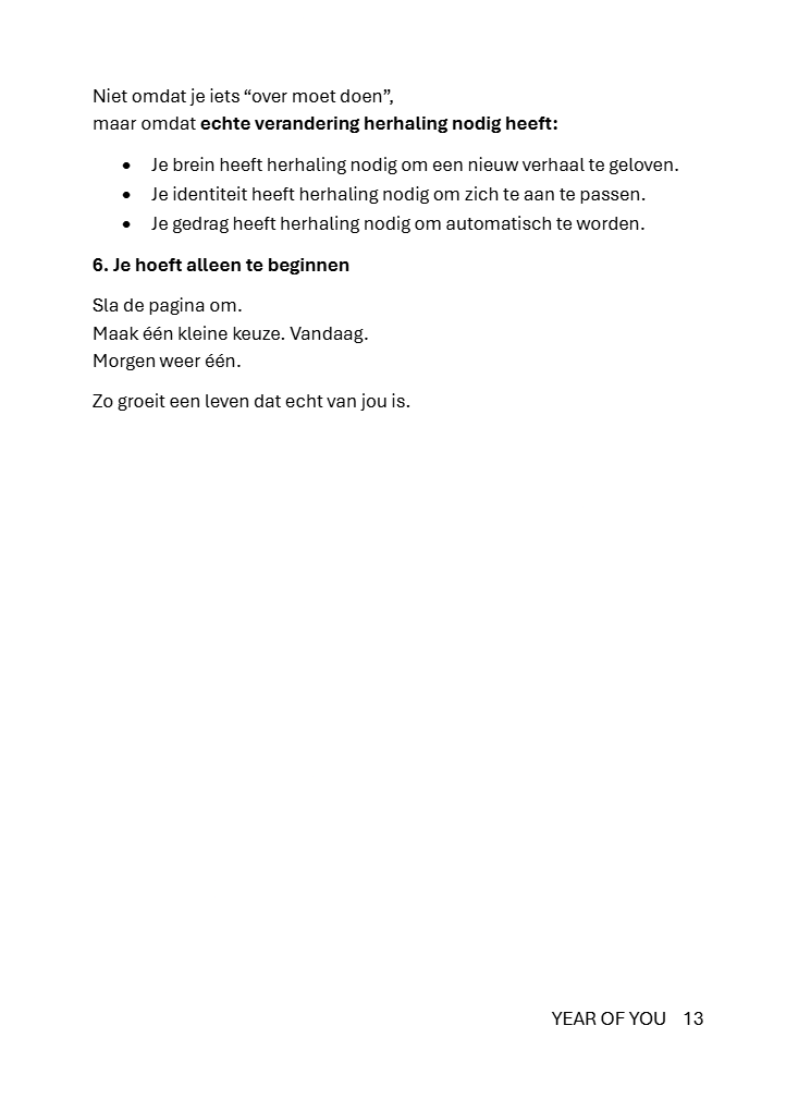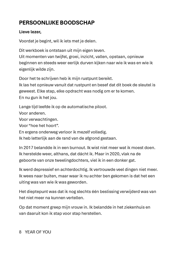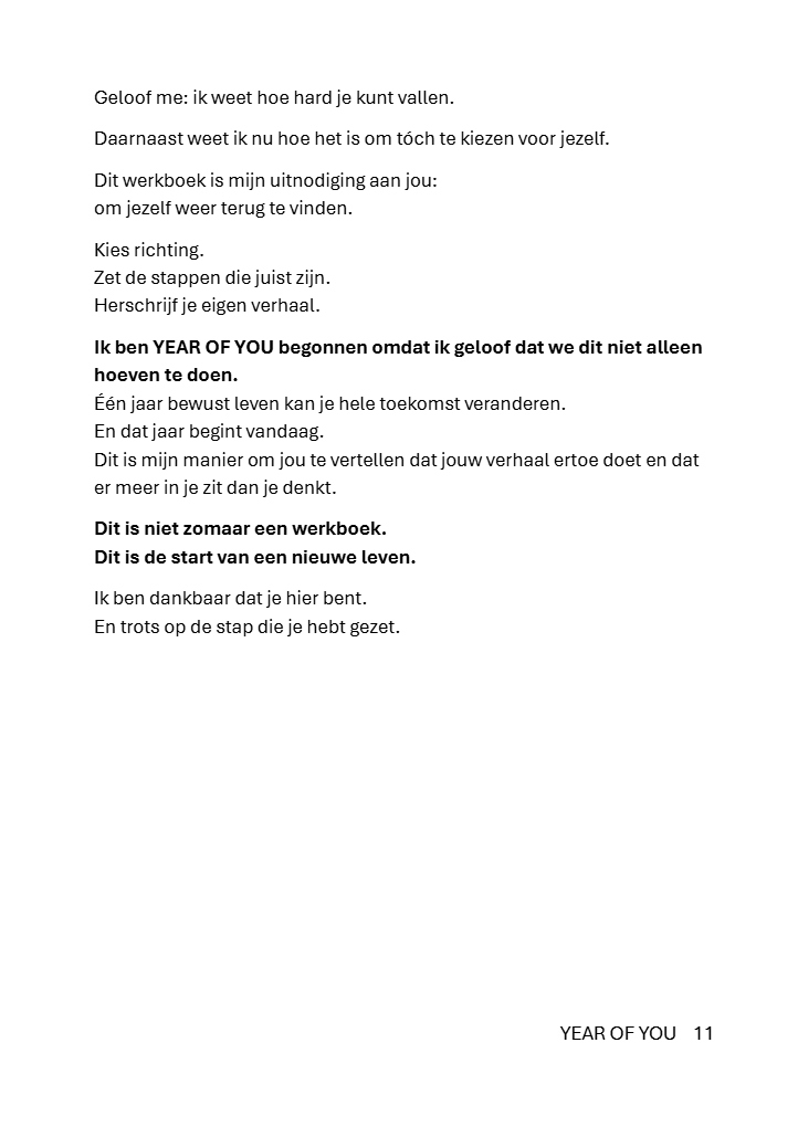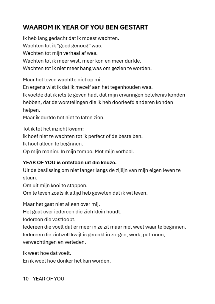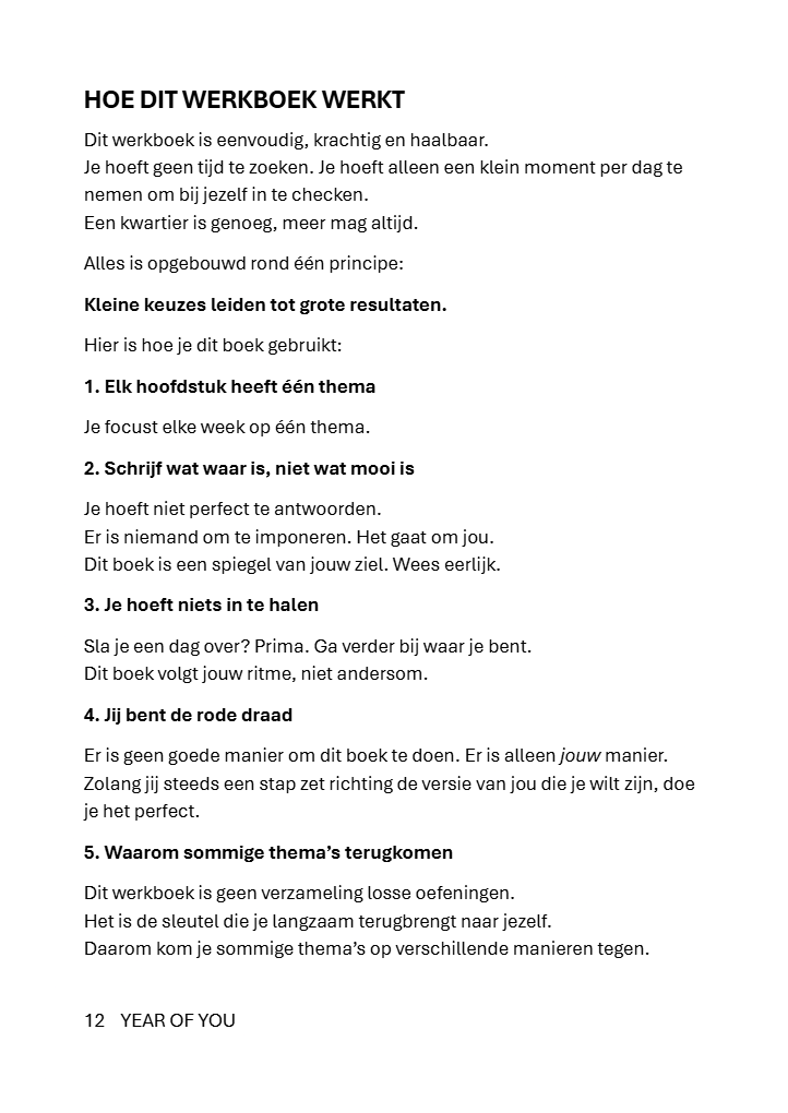 YEAR OF YOU is een praktisch en eerlijk, stevig gebonden werkboek dat je stap voor stap begeleidt naar de versie van jou die al in je leeft en zichtbaar wil worden.
